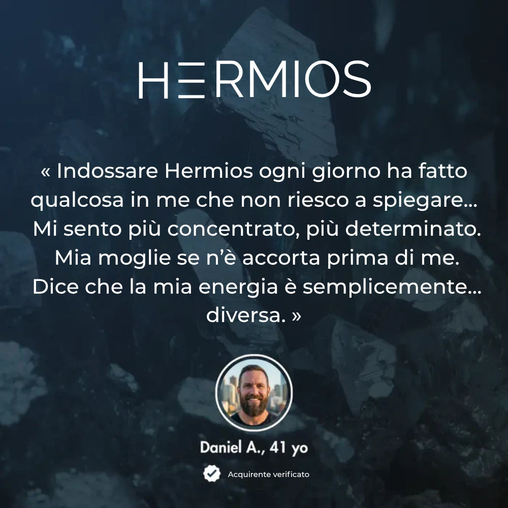 Prova Hermios per 30 giorni. Tutto qui. Indossalo durante riunioni, allenamenti e quelle lunghe giornate che prima ti esaurivano. Sentirai la tua energia tornare, la tua concentrazione affinarsi, la tua energia naturale riaccendersi. Non ti senti ancora pronto? Rimborso completo. Nessuna domanda. Solo risultati o rimborso.
